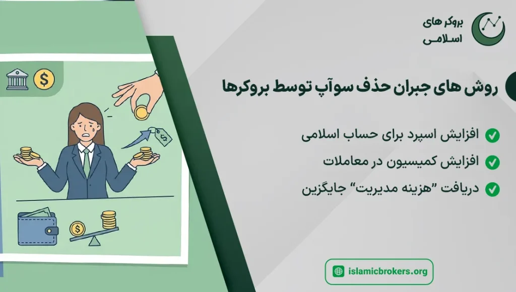 - دریافت “هزینه مدیریت” جایگزین: برخی بروکرها برای معاملات با نگهداری طولانی (مثلاً بیشتر از ۷ یا ۱۰ روز) نوعی کارمزد مدیریت (ثابت یا درصدی) دریافت می کنند که باید دقت شود این هزینه شکل ربوی نداشته باشد.